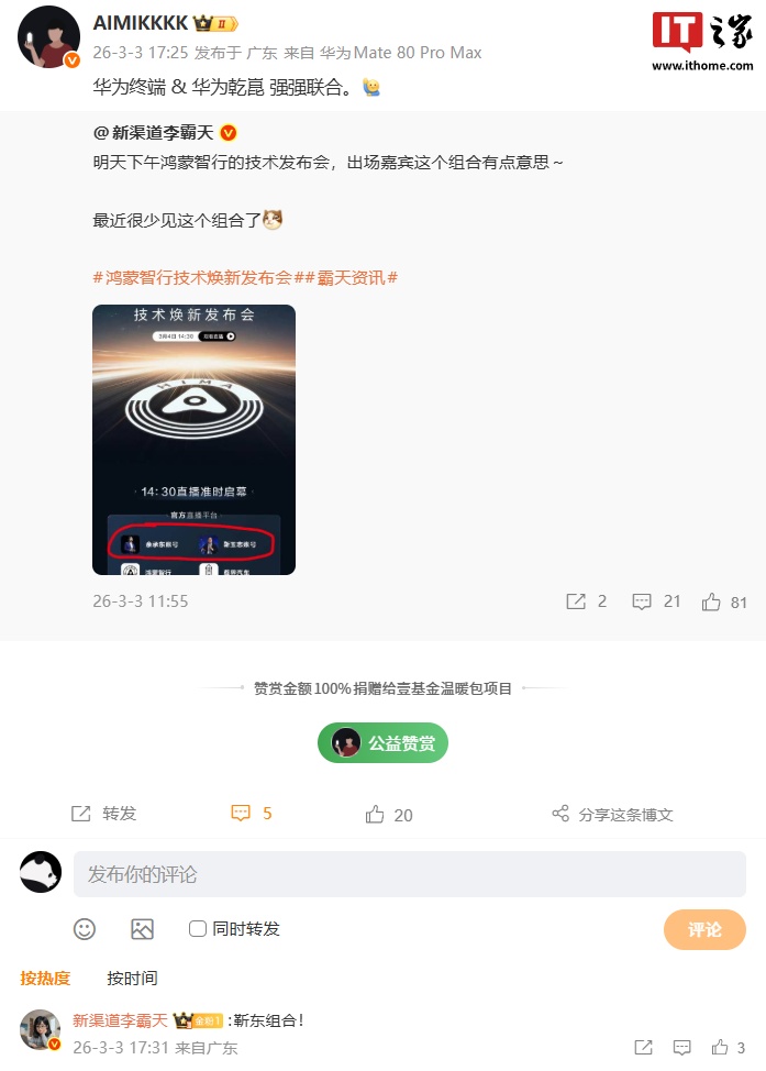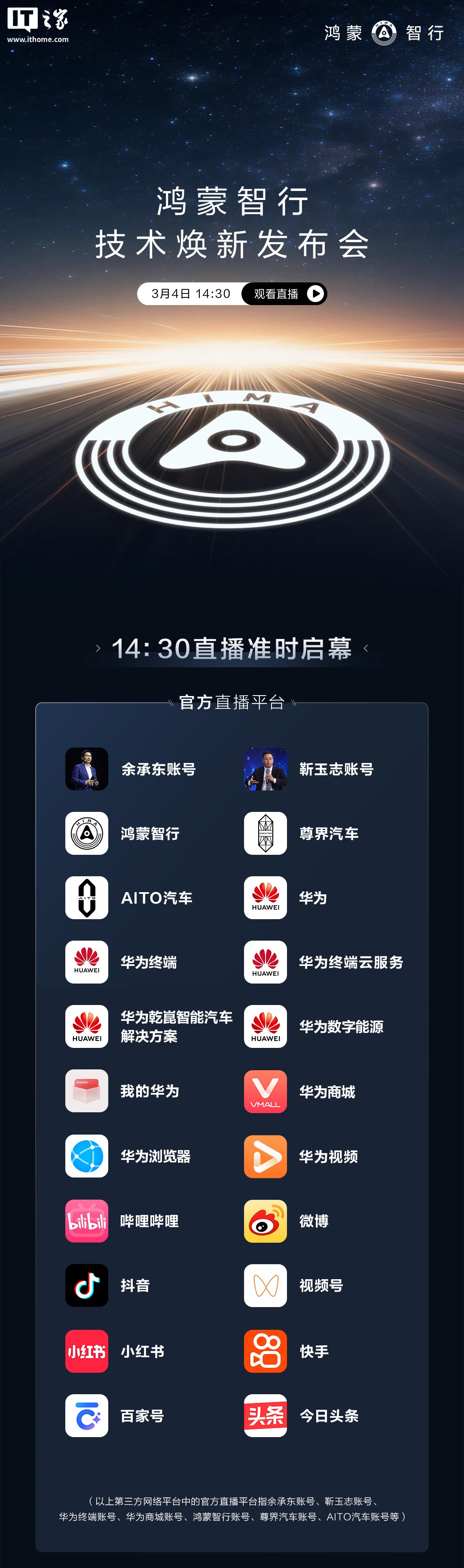 华为终端 × 华为乾崑强强联合:余承东、靳玉志有望在鸿蒙智行技术焕新发布会同台亮相