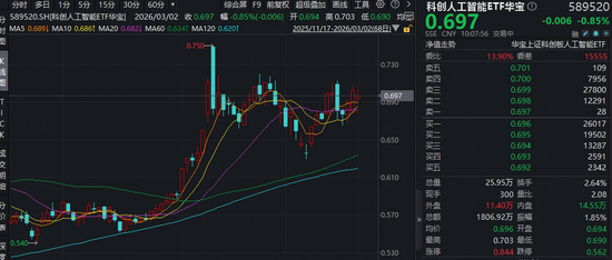 或由于美伊地缘事件扰动,科技方向短期情绪受冲击,3月2日,重点布局国产AI产业链的科创人工智能ETF(589520)场内价格在水面下震荡,场内价格现跌0.85%,但当前仍在所有均线上方,冲击日线3连阳!